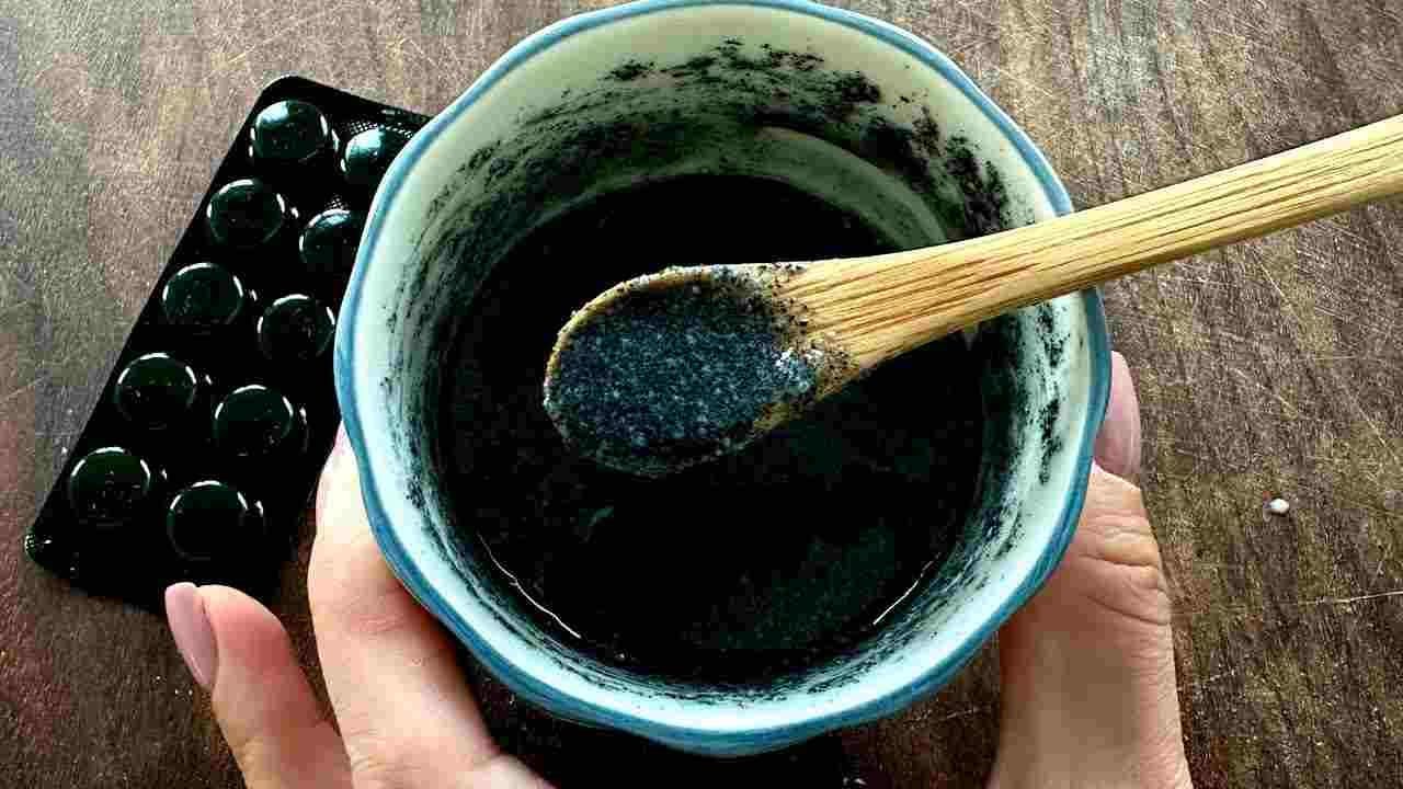Prendete due piccole ciotole. In una verserete un cucchiaio di gelatina e nell’altra invece tre compresse di carbone attivo, che potete trovare in farmacia o in erboristeria. In questa seconda ciotola, aggiungete due cucchiaini di acqua in modo che il carbone attivo inizi a sciogliersi.